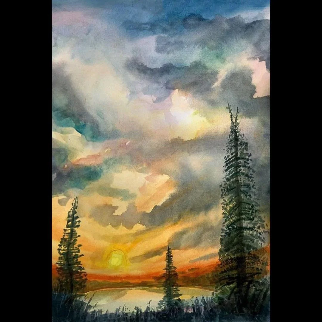 Experience how water and pigment mix by starting with softer tones and gradually working layer by layer till you achieve atmospheric perspective. The choice of colours is entirely up to you, it could be a cold blue scene or a hot summer scene. It could even work in pink!